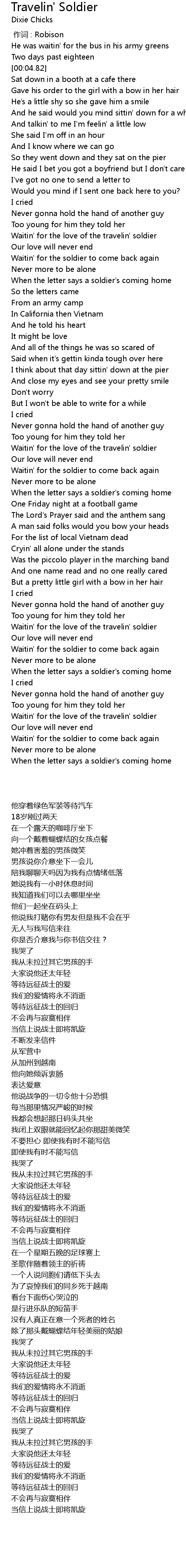 | [04:22.38] | Waitin' for the love of the travelin' soldier |