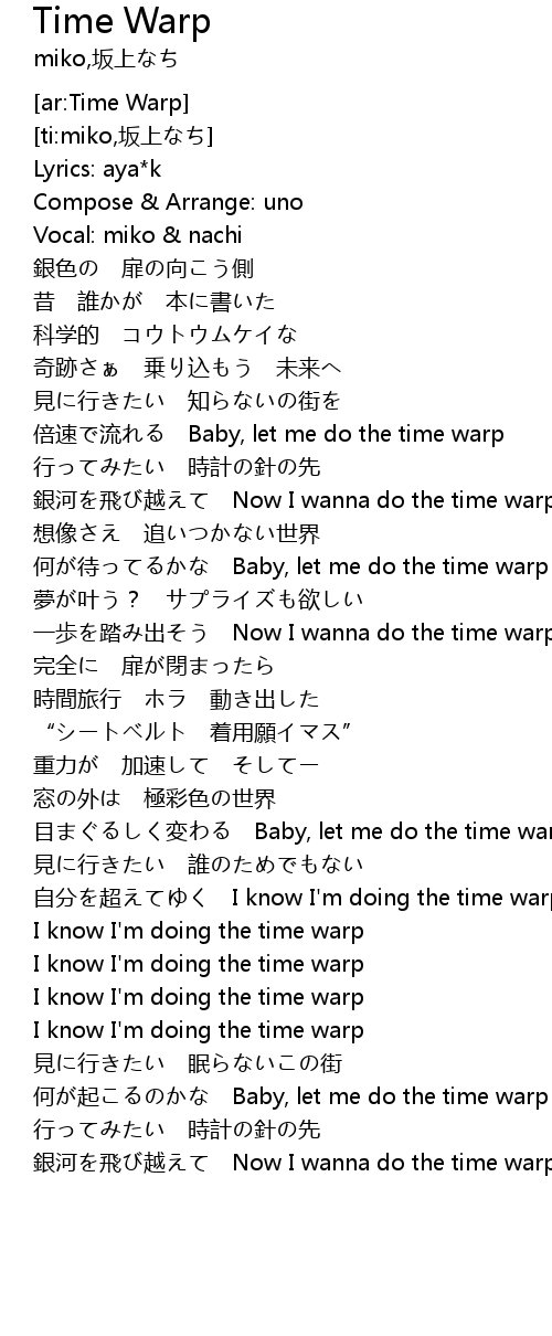 | [02:26.34] | mù biàn Baby, let me do the time warp |