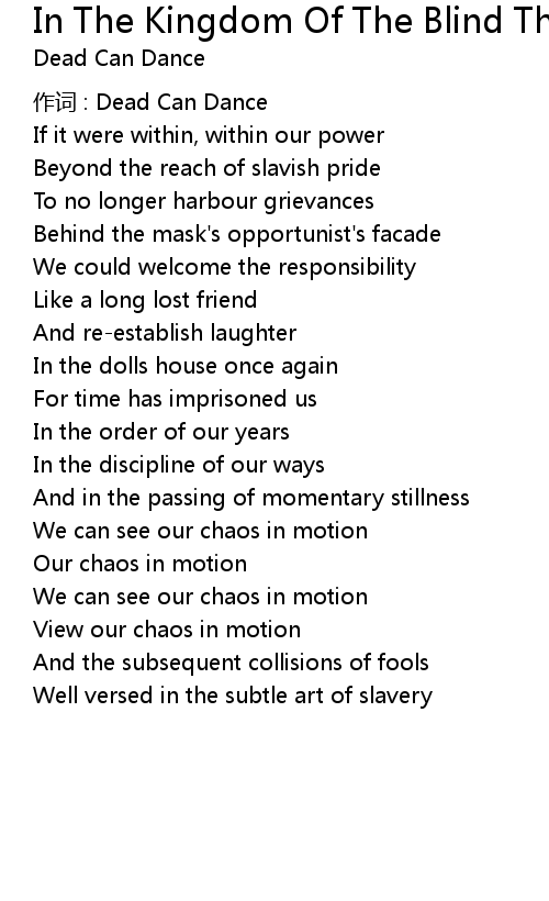 | Song | In The Kingdom Of The Blind The One-Eyed Are Kings |