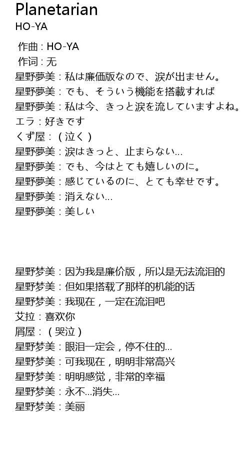 | [00:12.34] | 星野夢美:私は今、きっと涙を流していますよね。 |
