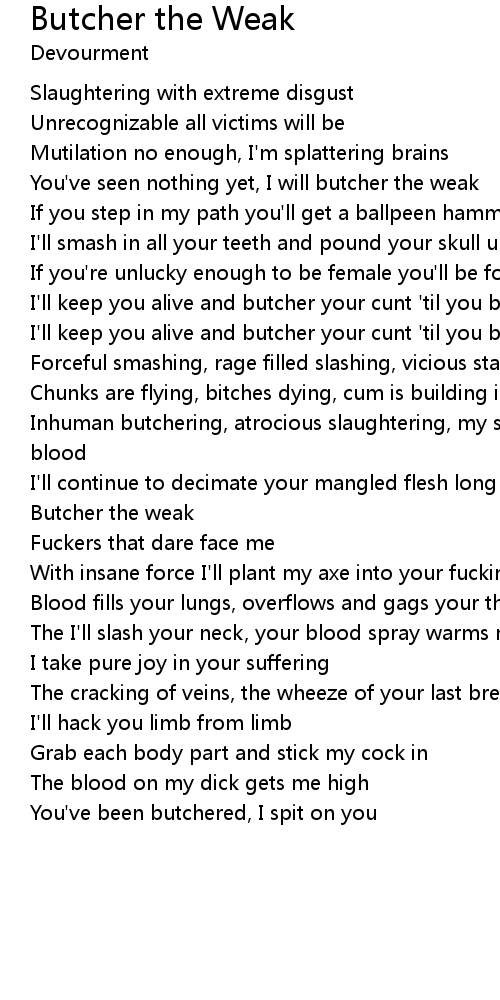 I'll keep you alive and butcher your cunt 'til you beg me to end your life |