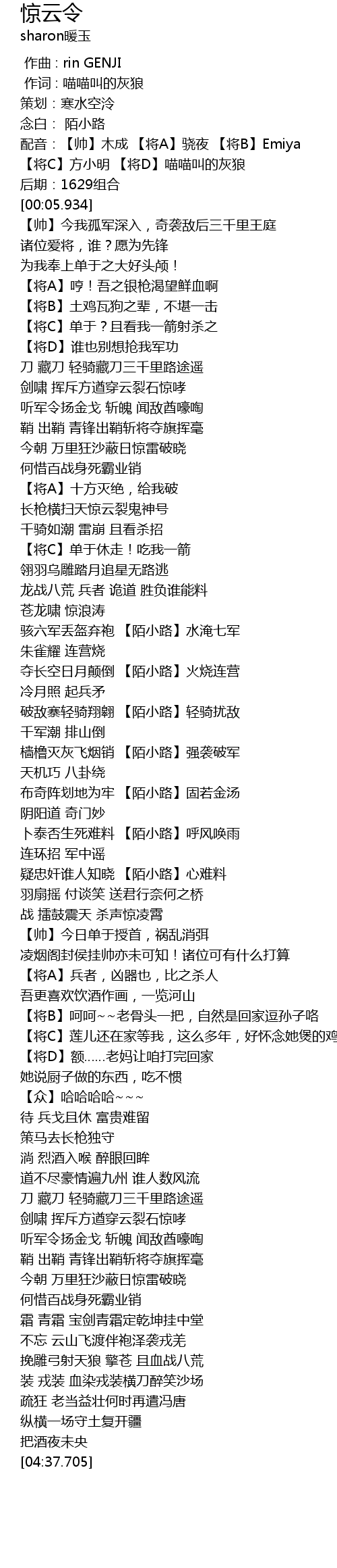| [00:04.558] | 【将C】方小明 【将D】喵喵叫的灰狼 |