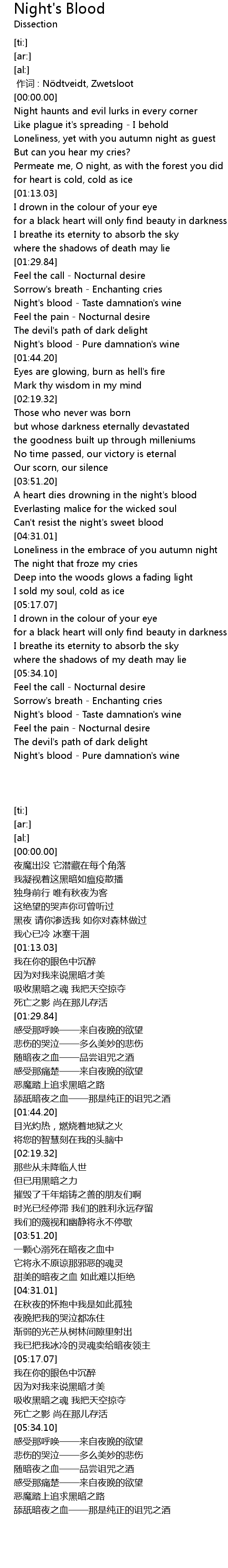 | [01:41.31] | Night' s blood Pure damnation' s wine |