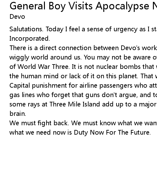 There is a direct connection between Devo's work in the music field and a big wiggly world around us. You may not be aware of this, but we are in the middle of World War Three. It is not nuclear bombs that we must fear; the weapons is the human mind or lack of it on this planet. That will determine our fate. Capital punishment for airline passengers who attempt to save money; Spud Men in gas lines who forget that guns don't argue, and tourists attempting to catch some rays at Three Mile Island add up to a major attack of corkscrews in the brain. |