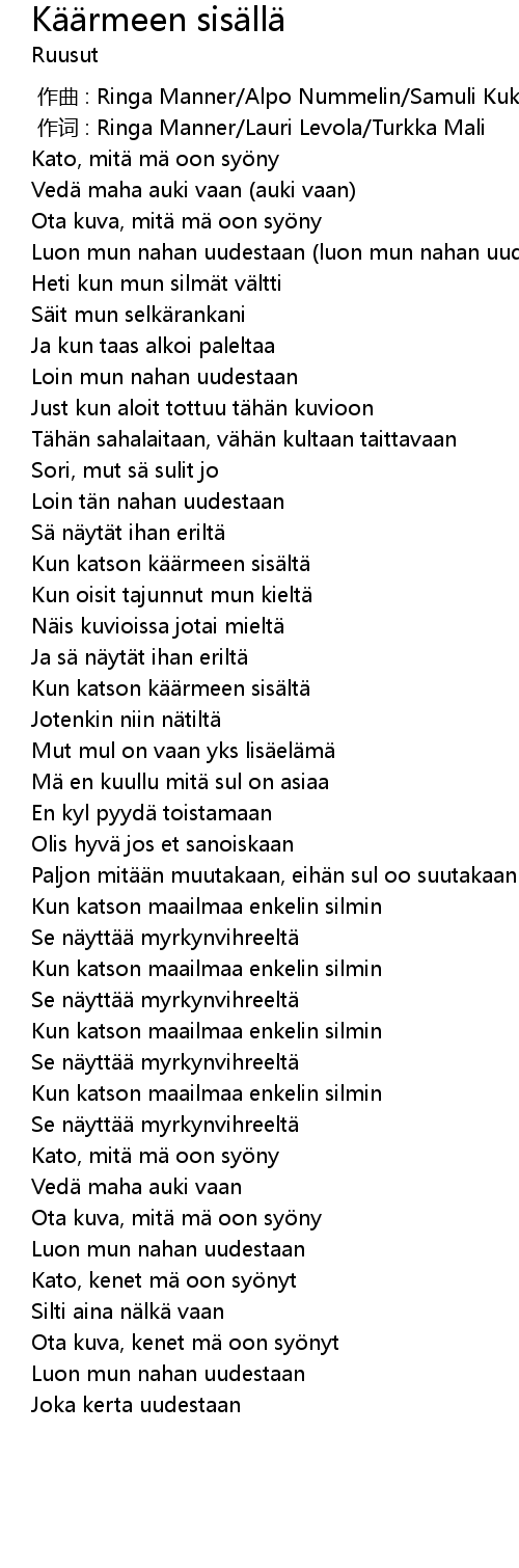 | [00:00.000] | zuo qu : Ringa Manner Alpo Nummelin Samuli Kukkola Miikka Koivisto |