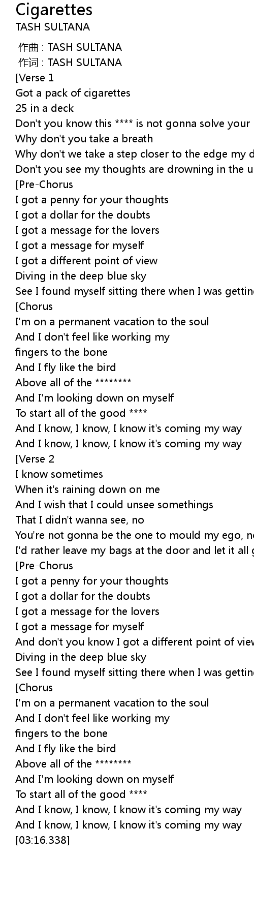 | [00:10.851] | Got a pack of cigarettes |