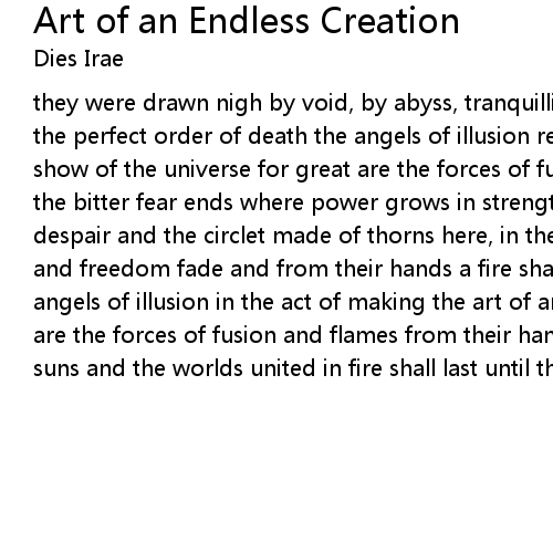 they were drawn nigh by void, by abyss, tranquillity, heat, demise and silence the perfect order of death the angels of illusion ready for creation the grand show of the universe for great are the forces of fusion and flames there, where the bitter fear ends where power grows in strength for open are the goblets of despair and the circlet made of thorns here, in the caves, where the illusion and freedom fade and from their hands a fire shall spring and craft the suns the angels of illusion in the act of making the art of an endless creation for great are the forces of fusion and flames from their hands a fire shall spring the suns and the worlds united in fire shall last until the next creation |