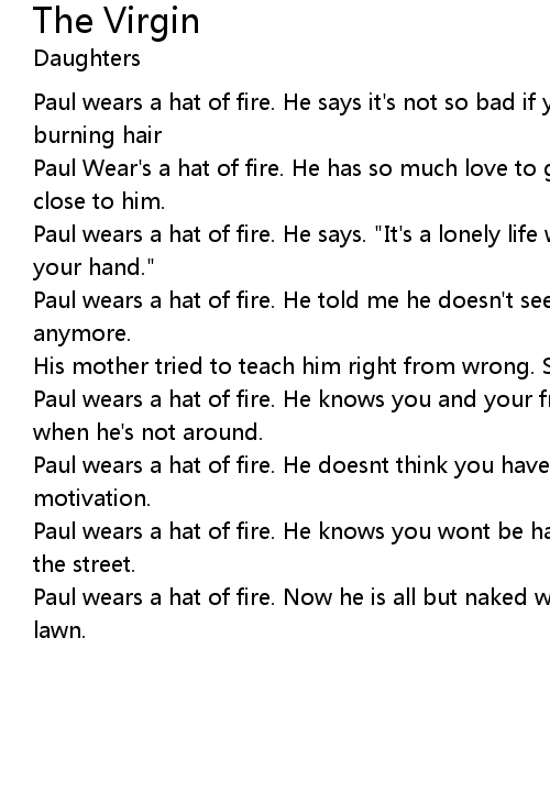 | Paul Wear's a hat of fire. He has so much love to give. But no one will get close to him. | |
