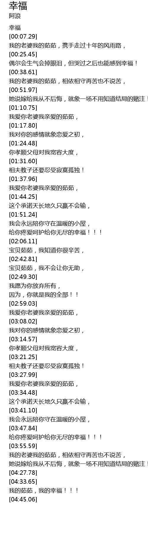 | [00:39.30] | 我的老婆我的茹茹,相依相守再苦也不说苦, |