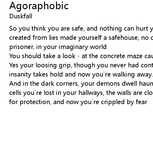 | And in the dark corners, your demons dwell haunting your mind, infecting the cells you´re lost in your hallways, the walls are closing in built your house for protection, and now you´re crippled by fear |