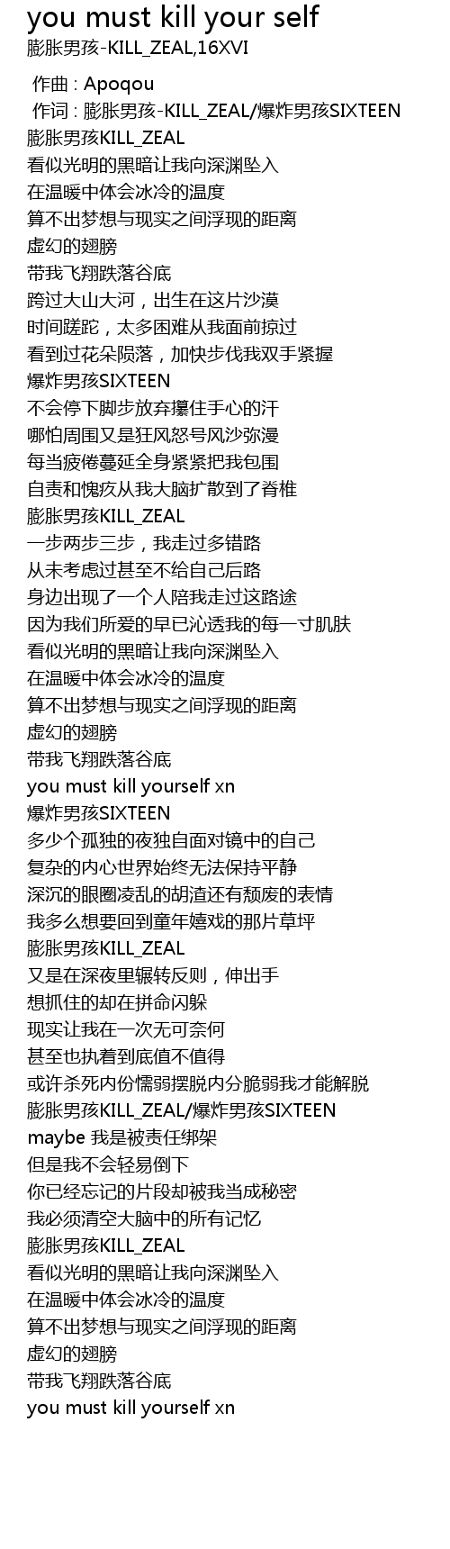 | [00:01.000] | 作词 : 膨胀男孩-KILL_ZEAL/爆炸男孩SIXTEEN |