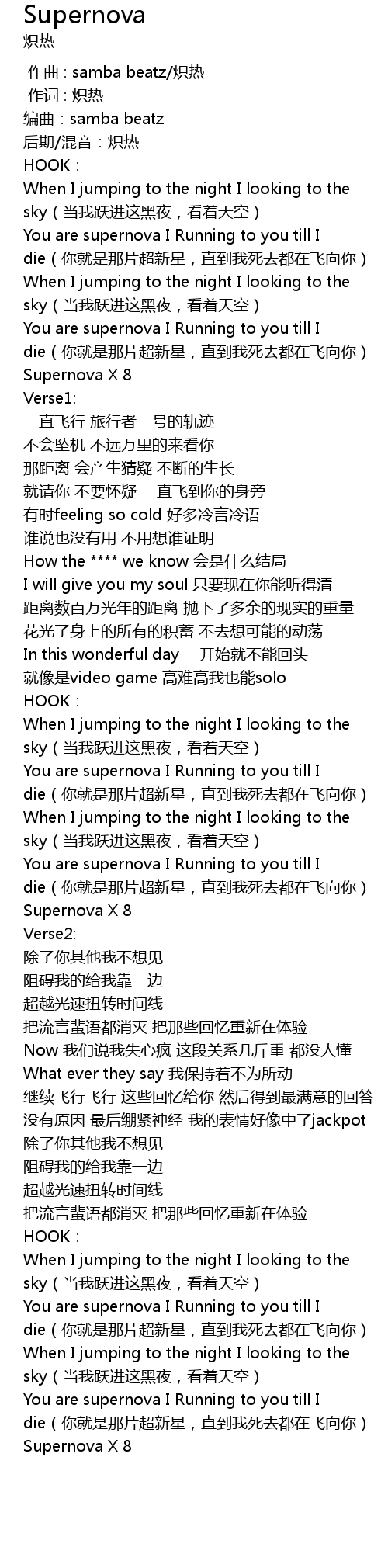 | [00:25.873] | You are supernova I Running to you till I die nǐ jiù shì nà piàn chāo xīn xīng, zhí dào wǒ sǐ qù dōu zài fēi xiàng nǐ |
