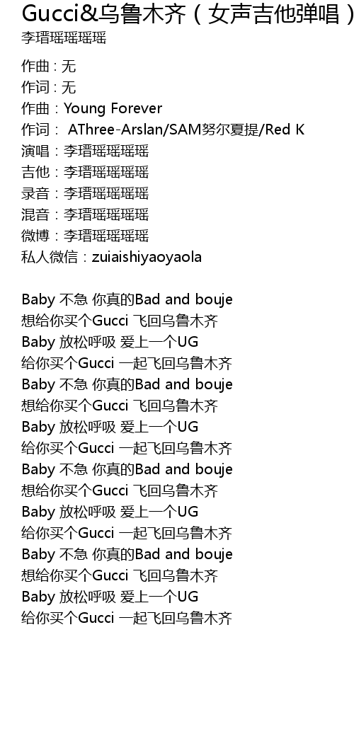 | Song | Gucci&乌鲁木齐(女声吉他弹唱)(Cover HAS) |