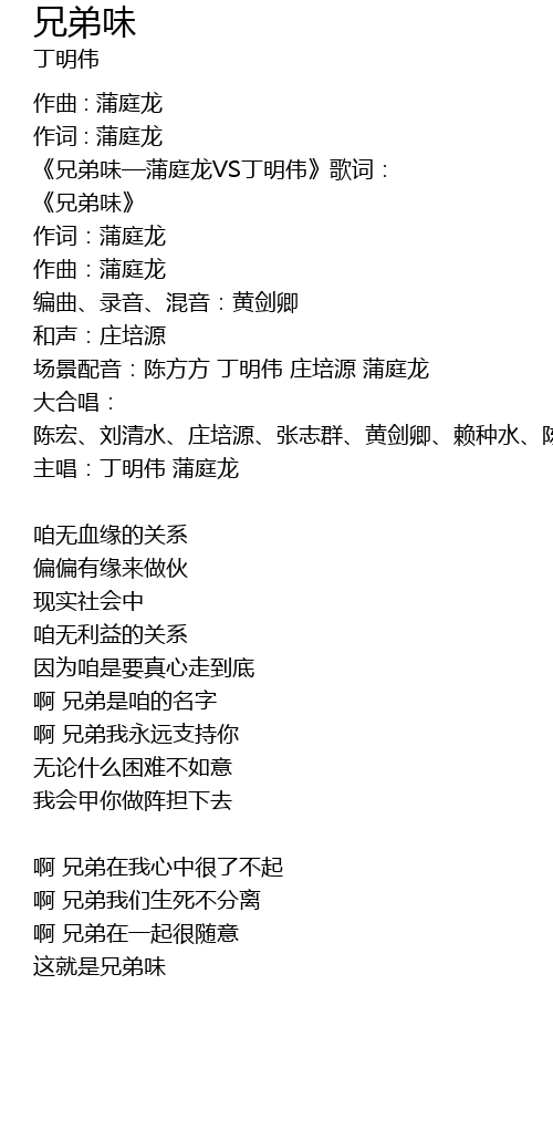 | 《兄弟味—蒲庭龙VS丁明伟》歌词: | |