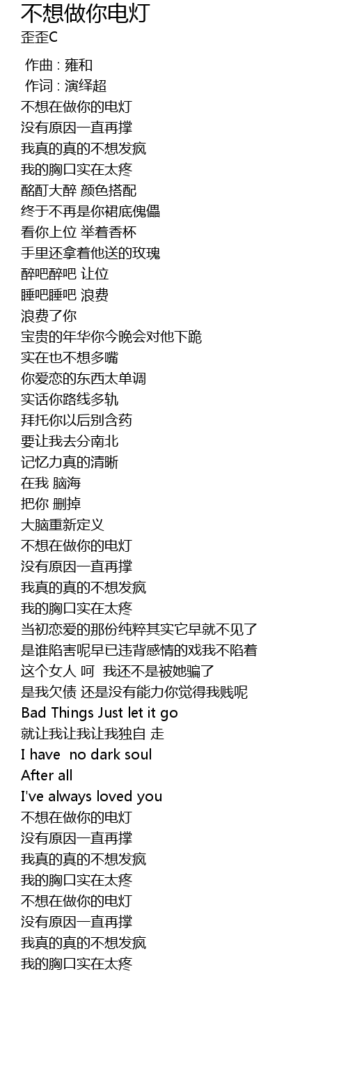 | [01:43.44] | bù xiǎng zài zuò nǐ de diàn dēng |