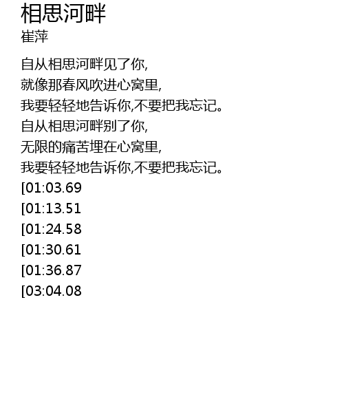 | [02:52.03][01:30.61] | 自从相思河畔别了你, |