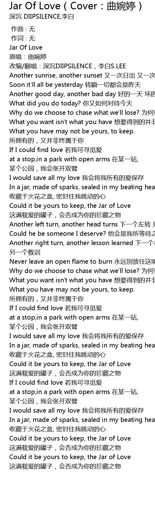 | [02:38.95] | Could it be yours to keep, the Jar of Love zhè mǎn zài ài de guàn zi, huì fǒu chéng wéi nǐ de zhēn cáng zhī wù |