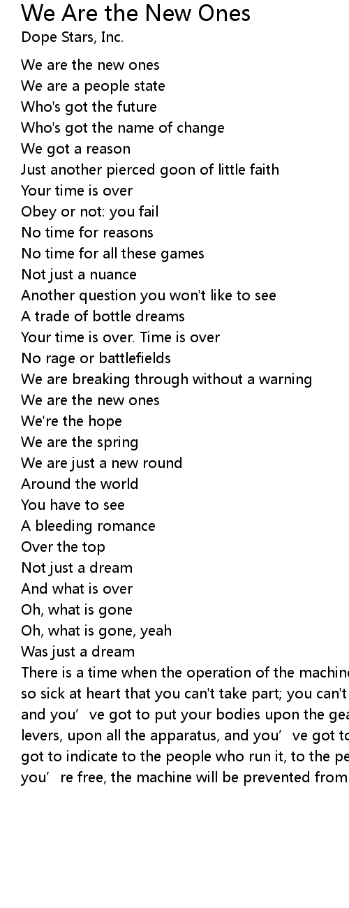 | There is a time when the operation of the machine becomes so odious, makes you so sick at heart that you can't take part; you can't even passively take part, and you’ve got to put your bodies upon the gears and upon the wheels, upon the levers, upon all the apparatus, and you’ve got to make it stop. And you’ve got to indicate to the people who run it, to the people who own it, that unless you’re free, the machine will be prevented from working at all! |