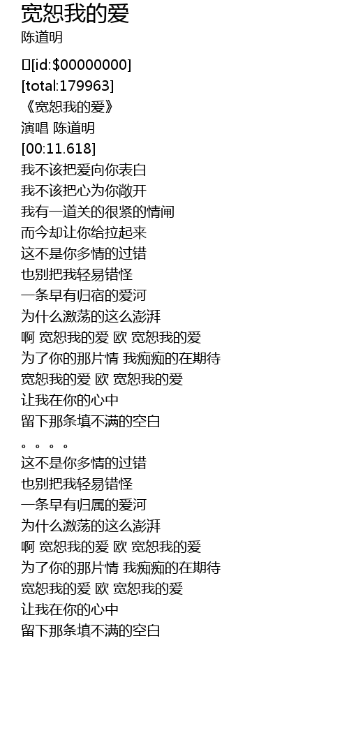 | [02:32.179] | 宽恕我的爱 欧 宽恕我的爱 |