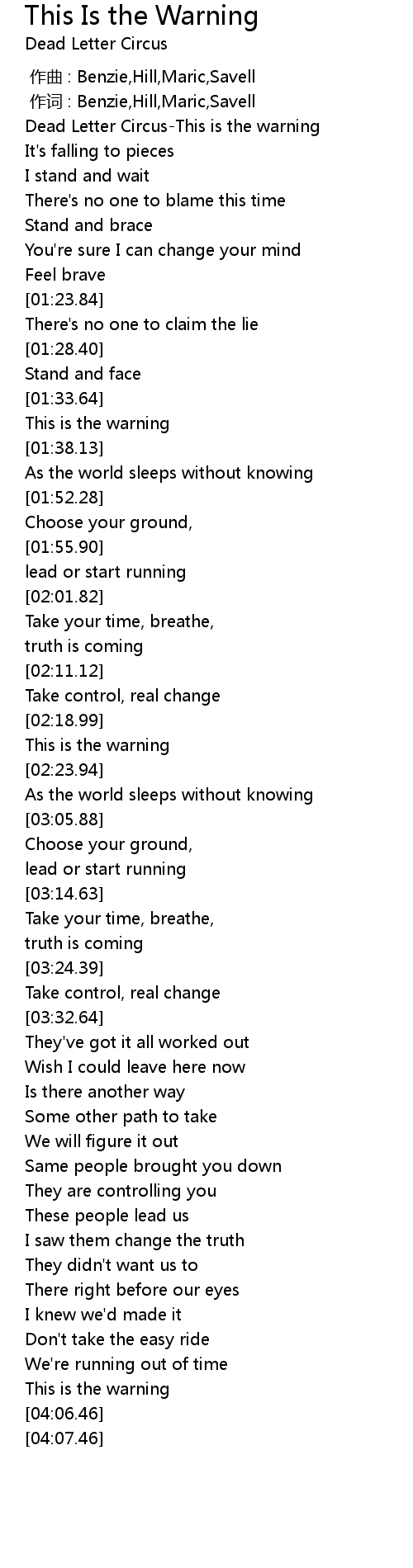 | [00:00.77] | Dead Letter CircusThis is the warning |