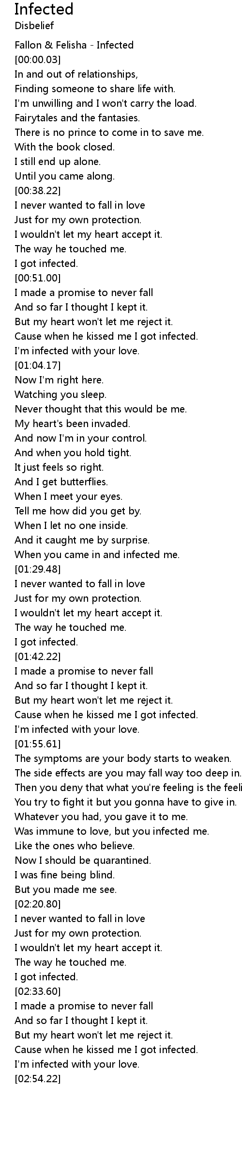| [02:42.18] | Cause when he kissed me I got infected. |