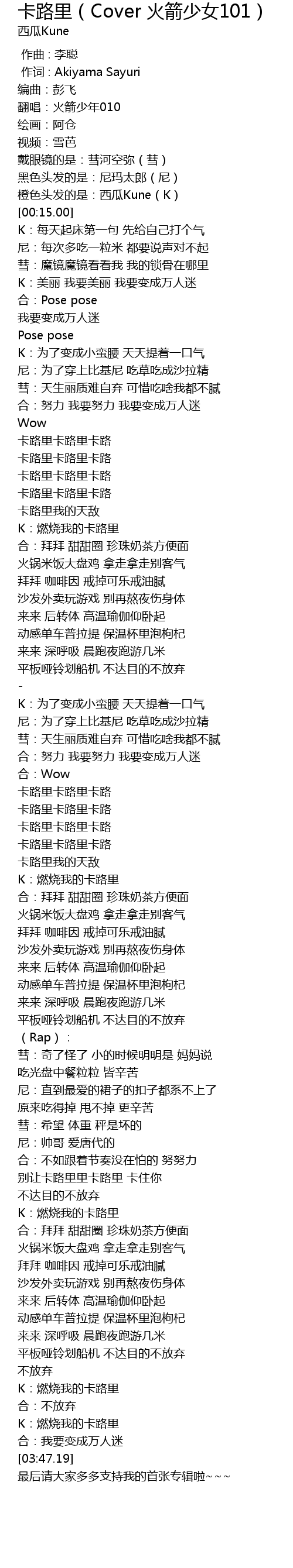 | [01:02.53] | kǎ lù lǐ kǎ lù lǐ kǎ lù |