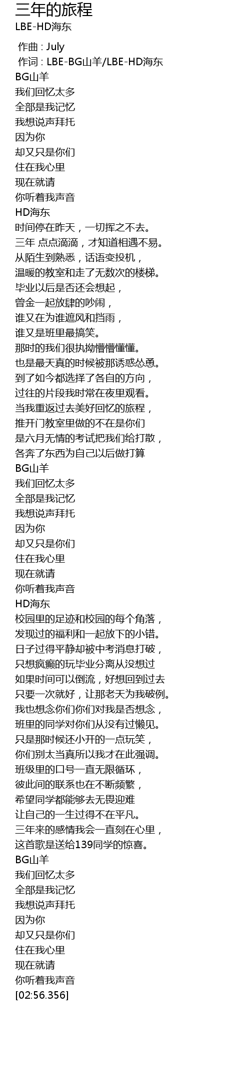 | [00:26.375] | 三年 点点滴滴,才知道相遇不易。 |