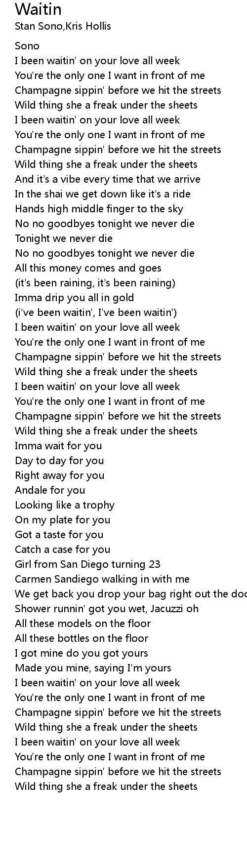 | [00:25.62] | I been waitin' on your love all week |