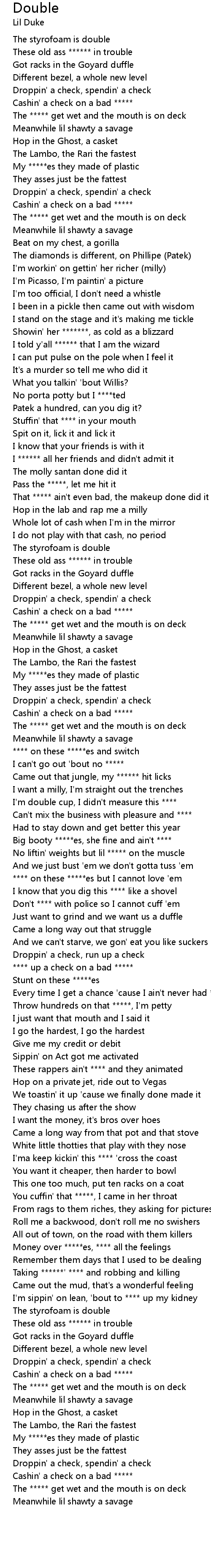 | [02:06.95] | No liftin' weights but lil ***** on the muscle |