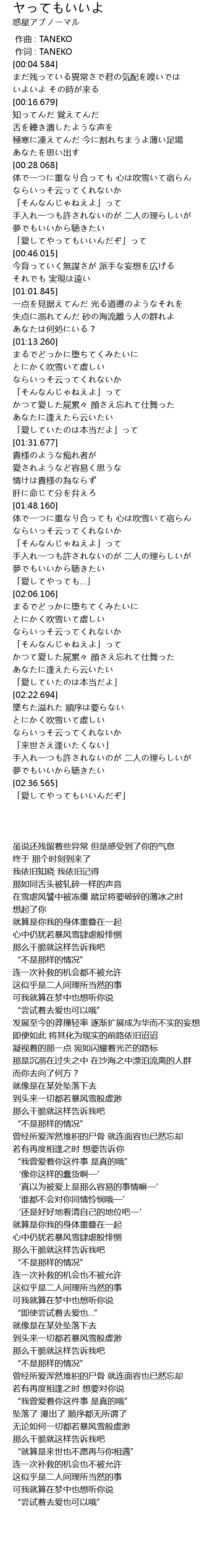 | [02:22.877] | 墜ちた溢れた 順序は要らない とにかく吹雪いて虚しい |