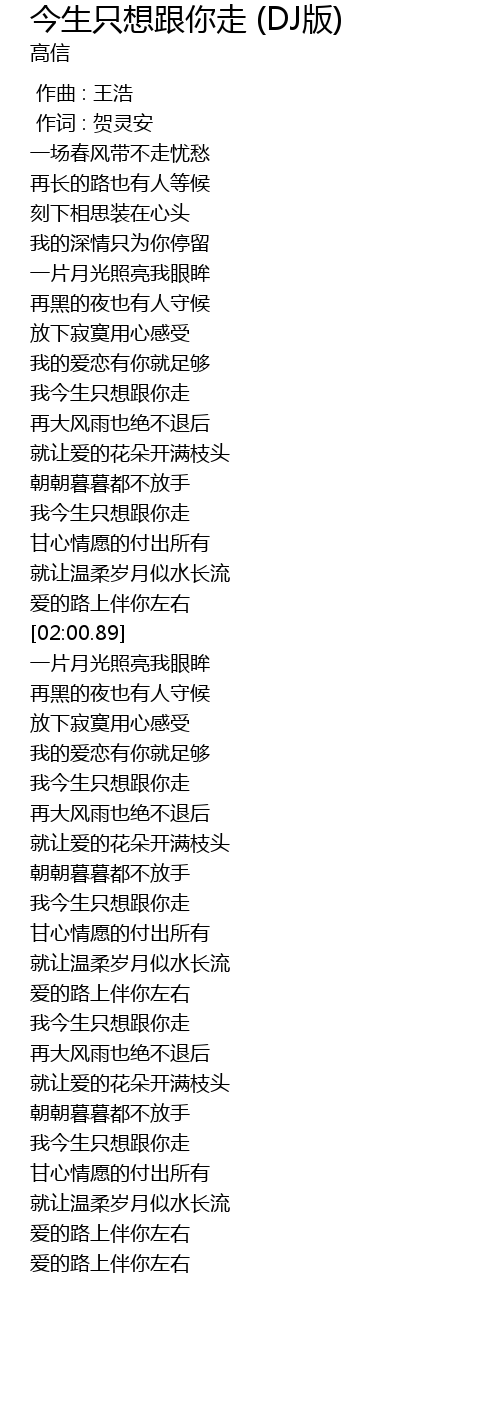 | [01:36.94] | wǒ jīn shēng zhǐ xiǎng gēn nǐ zǒu |