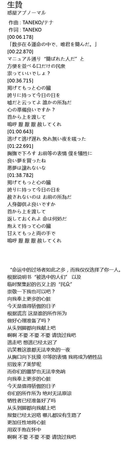 | [01:23.108] | 胸撫で下ろす お前等の表情 僕を犠牲に 良い夢を買ったね |