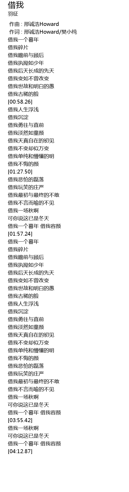 | [00:01.000] | 作词 : 邢诚浩Howard/樊小纯 |