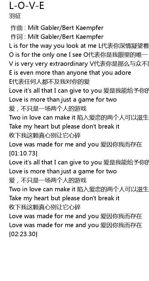 | [00:10.05] | L is for the way you look at me L dài biǎo nǐ shēn qíng níng wàng zhe wǒ |