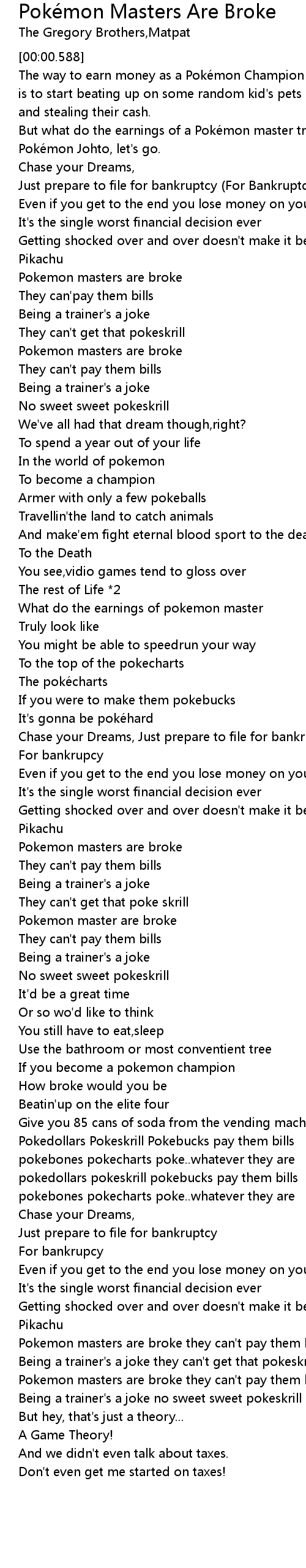 | [03:18.648] | Pokemon masters are broke they can' t pay them bills |