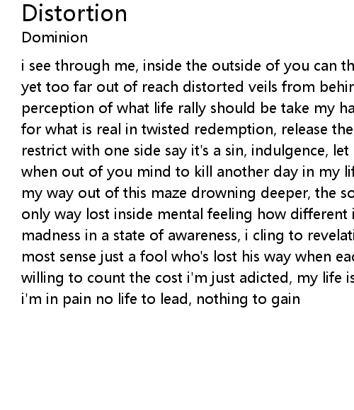 | i see through me, inside the outside of you can things seem so close so near, yet too far out of reach distorted veils from behind which only i see the clear perception of what life rally should be take my hand, dependent to feel insanity for what is real in twisted redemption, release the confines reality seems to restrict with one side say it's a sin, indulgence, let it suck you in at peace when out of you mind to kill another day in my life seems so feint, can't find my way out of this maze drowning deeper, the soul believer taking my life is the only way lost inside mental feeling how different i percieve this life of unseen madness in a state of awareness, i cling to revelations inverted to make the most sense just a fool who's lost his way when each night blurs into day not willing to count the cost i'm just adicted, my life is lost can't you see, fuck i'm in pain no life to lead, nothing to gain |