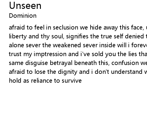 | afraid to feel in seclusion we hide away this face, unseen, instinct denies true liberty and thy soul, signifies the true self denied the role destined to be alone sever the weakened sever inside will i forever live in deceit of myself? trust my imptression and i've sold you the lies that hide as they reflect the same disguise betrayal beneath this, confusion weeps inner tears untold in fear, afraid to lose the dignity and i don't understand why hate should rise above to hold as reliance to survive |
