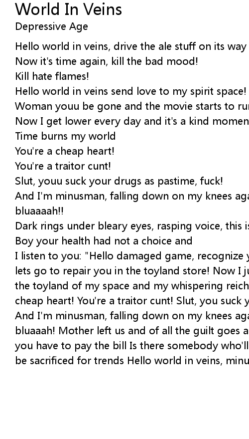 I listen to you: "Hello damaged game, recognize your child again! Hello dad, lets go to repair you in the toyland store! Now I just need to find the train to the toyland of my space and my whispering reich Time burns my world You're a cheap heart! You're a traitor cunt! Slut, you suck your drugs as pastime, fuck! And I'm minusman, falling down on my knees again, scream to my mirror's shame, bluaaah! Mother left us and of all the guilt goes a great part to my side Child, you have to pay the bill Is there somebody who'll give this tale an end? I won't be sacrificed for trends Hello world in veins, minusman's my name