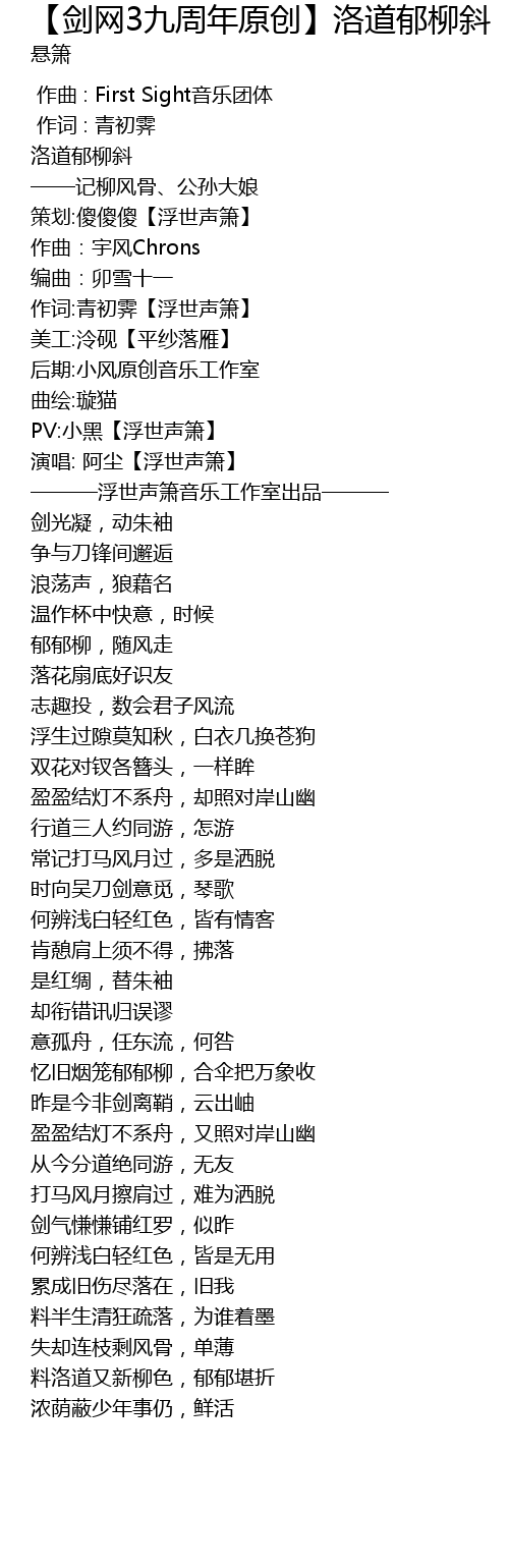 | Song | 【剑网3九周年原创】洛道郁柳斜 |