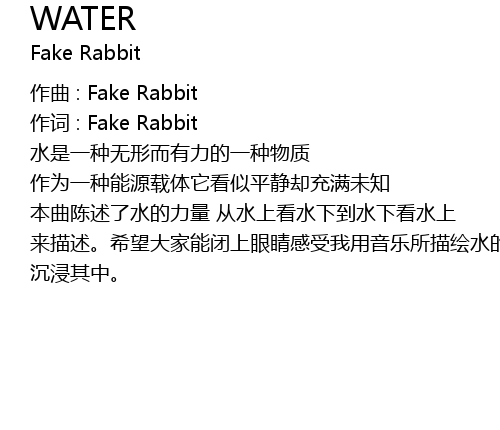 | 水是一种无形而有力的一种物质 作为一种能源载体它看似平静却充满未知 本曲陈述了水的力量 从水上看水下到水下看水上 来描述。希望大家能闭上眼睛感受我用音乐所描绘水的世界感受水的力量 沉浸其中。 |