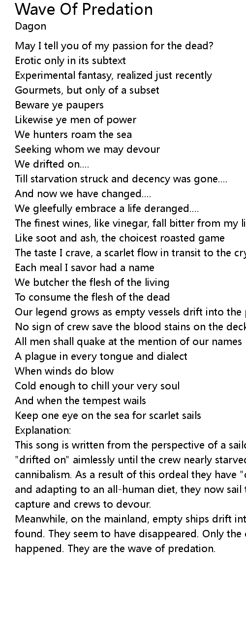 This song is written from the perspective of a sailor on a lost ship. The vessel "drifted on" aimlessly until the crew nearly starved and was forced into cannibalism. As a result of this ordeal they have "changed". Embracing deep evil and adapting to an all-human diet, they now sail the seas seeking ships to capture and crews to devour. |