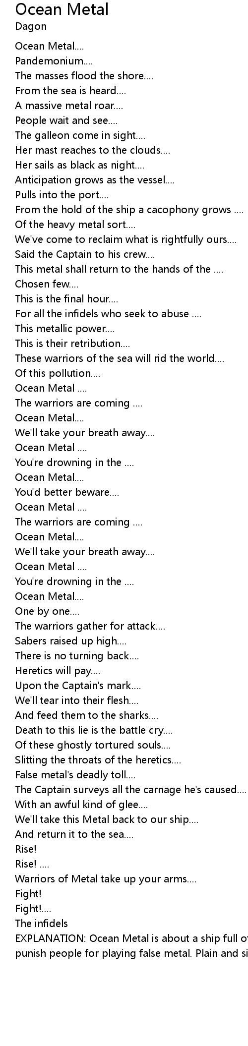 EXPLANATION: Ocean Metal is about a ship full of ghosts that come ashore to punish people for playing false metal. Plain and simple... NO FALSE METAL!!! |