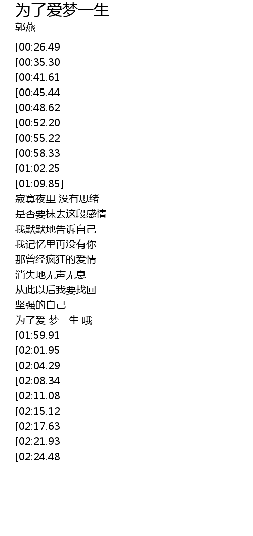 | [04:05.64][01:02.25] | 为了爱 梦一生 |
