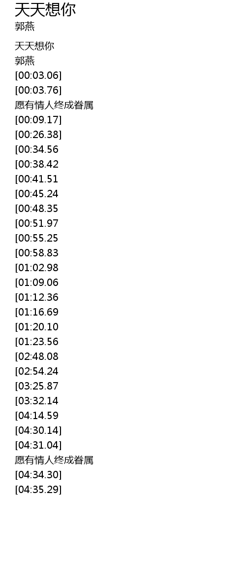 | [04:14.93][03:25.87][03:00.57][01:44.10] | 天天想你 天天守住一颗心 |