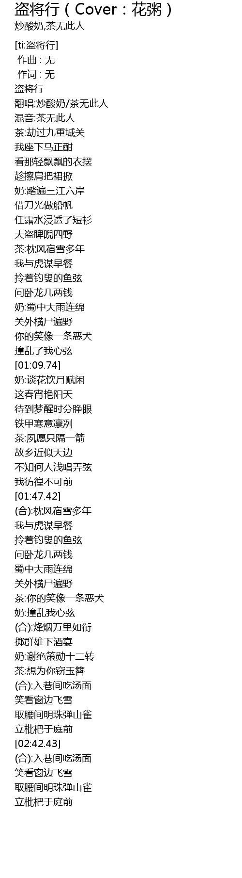 | [00:05.22] | 翻唱:炒酸奶/茶无此人 |