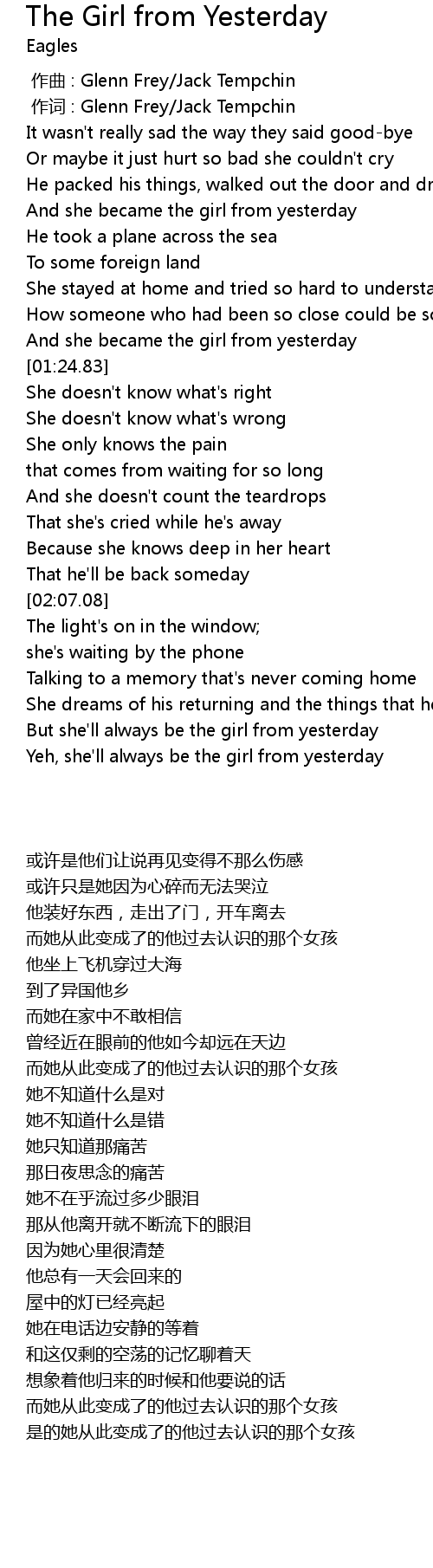 | [03:06.39] | Yeh, she' ll always be the girl from yesterday |