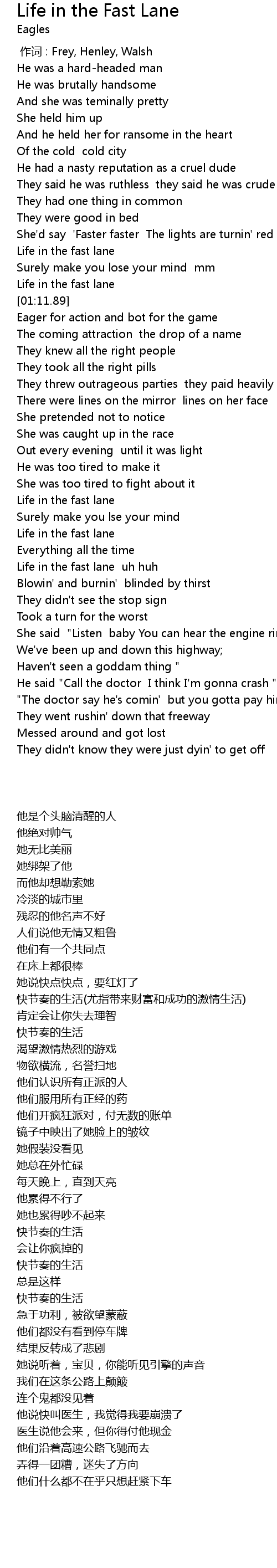 | [00:54.92] | She'd say 'Faster faster The lights are turnin' red " |