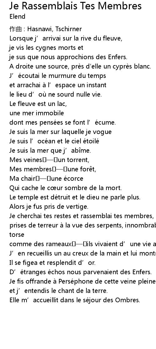 | Je cherchai tes restes et rassemblai tes membres, lorsque les pleureuses furent prises de terreur a la vue des serpents, innombrables, qui encerclaient ton torse | |