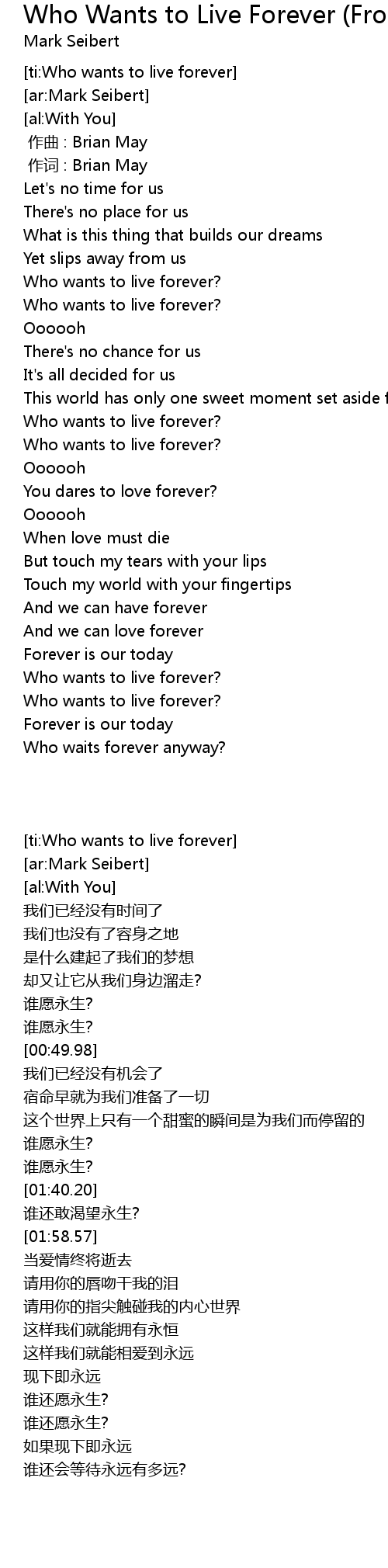 | Song | Who Wants to Live Forever (From the Musical "We Will Rock You") |