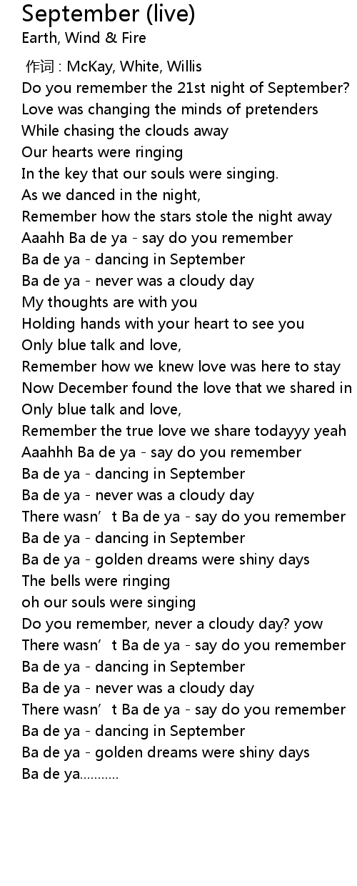 | [00:48.53] | Ba de ya dancing in September |